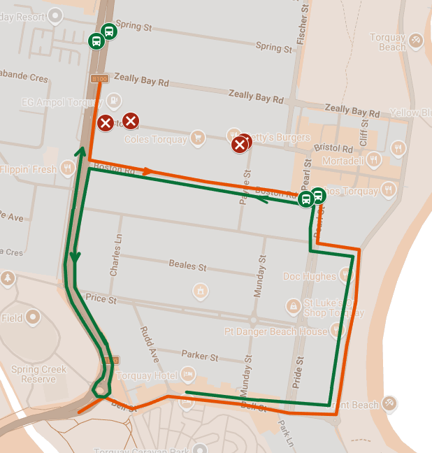 Inbound Route 52 will detour via Boston Rd, Left Surf Coast Hwy and continue to Bell St/Great Ocean Rd roundabout where it will perform a U-turn to continue back onto Surf Coast Highway heading north as shown by the green line in the map below.
