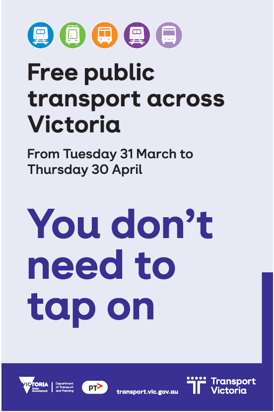 Following the recent Victorian Government announcement, Public Transport in Victoria will be free for everyone, from Tuesday 31 March to Thursday 30 April 2026.