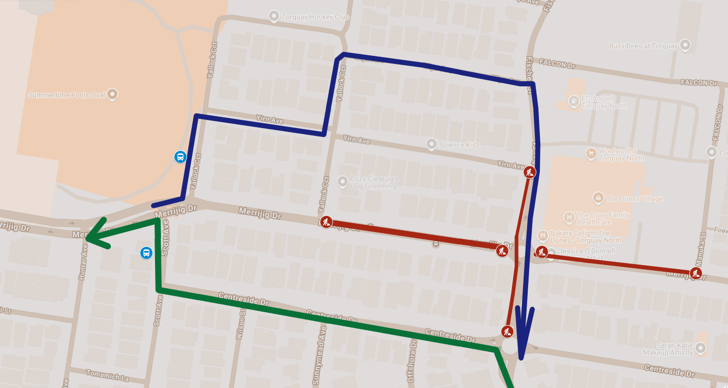 INBOUND ROUTE 53 will detour via Left Centreside Drive, Right Scott Ave, Left Merrijig Dr, and Right to Surf Coas Hwy and continue route as normal. A temporary stop will be located in Scott Ave as shown by the blue bus.