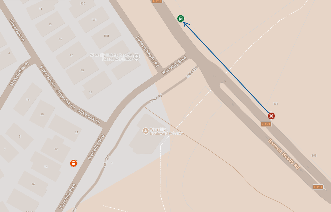 The outbound bus stop 46447 Warralily Blvd on Barwon Heads Rd will be moved approximately 100m north, closer to the pedestrian crossing at the north side of Warralily Blvd/Barwon Heads Rd intersection as shown by the green bus.